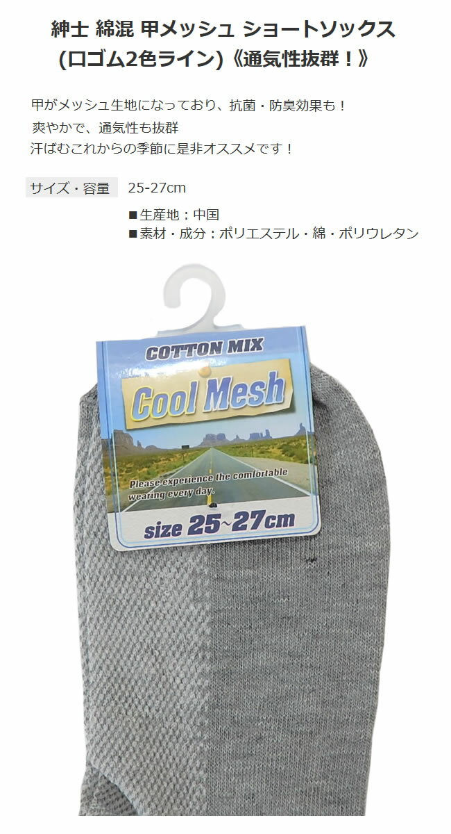 甲メッシュ アンクルソックス 靴下 25-27cm メンズソックス 無地 シンプル アンクル丈 スニーカー丈 綿混 くるぶし丈ソックス 通気性 春夏 おしゃれ メール便発送可能 5308656-4012-1-00M