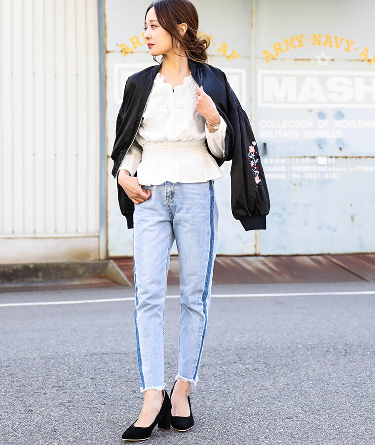 刺繍袖 ショート丈MA-1 レディース ミリタリージャケット ライトアウターはサイジングが命 定番デザイン+ショート丈、これが旬に見える鍵 刺繍袖がアクセントになり、 着たときのダボッとしたシルエットが最高に可愛いMA-1。